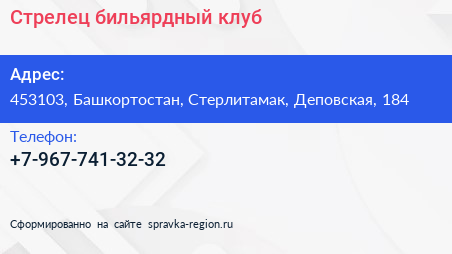Стрелец, бильярдный клуб по адресу 453103, Башкортостан, Стерлитамак, Деповская, 184 в дальнейшем Организация, размещена в следующих категориях: