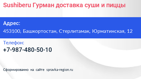 Sushiberu Гурман, доставка суши и пиццы по адресу 453100, Башкортостан, Стерлитамак, Юрматинская, 12 в дальнейшем Организация, размещена в следующих категориях: