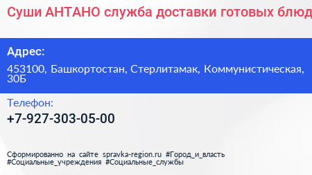 Суши АНТАНО, служба доставки готовых блюд по адресу 453100, Башкортостан, Стерлитамак, Коммунистическая, 30Б в дальнейшем Организация, размещена в следующих категориях: