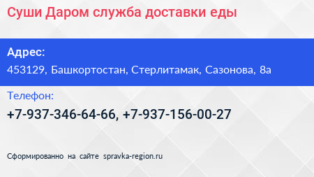 Суши Даром, служба доставки еды по адресу 453129, Башкортостан, Стерлитамак, Сазонова, 8а в дальнейшем Организация, размещена в следующих категориях: