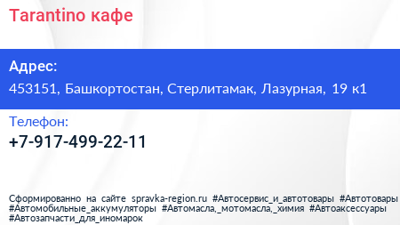 Tarantino, кафе по адресу 453151, Башкортостан, Стерлитамак, Лазурная, 19 к1 в дальнейшем Организация, размещена в следующих категориях: