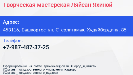 Творческая мастерская Ляйсан Яхиной по адресу 453116, Башкортостан, Стерлитамак, Худайбердина, 85 в дальнейшем Организация, размещена в следующих категориях: