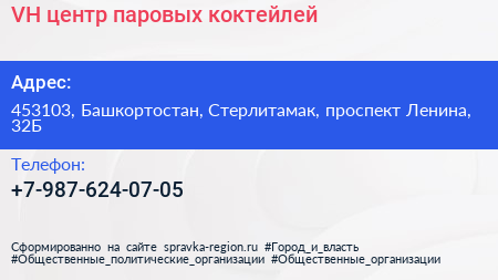 VH, центр паровых коктейлей по адресу 453103, Башкортостан, Стерлитамак, проспект Ленина, 32Б в дальнейшем Организация, размещена в следующих категориях: