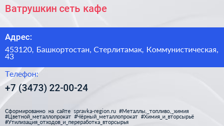 Ватрушкин, сеть кафе по адресу 453120, Башкортостан, Стерлитамак, Коммунистическая, 43 в дальнейшем Организация, размещена в следующих категориях: