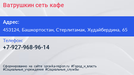 Ватрушкин, сеть кафе по адресу 453124, Башкортостан, Стерлитамак, Худайбердина, 65 в дальнейшем Организация, размещена в следующих категориях: