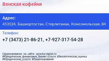 Венская кофейня по адресу 453124, Башкортостан, Стерлитамак, Комсомольская, 84 в дальнейшем Организация, размещена в следующих категориях: