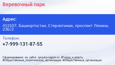 Веревочный парк по адресу 453107, Башкортостан, Стерлитамак, проспект Ленина, 23Б/2 в дальнейшем Организация, размещена в следующих категориях: