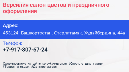 Версилия, салон цветов и праздничного оформления по адресу 453124, Башкортостан, Стерлитамак, Худайбердина, 44а в дальнейшем Организация, размещена в следующих категориях: