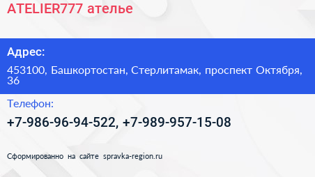 ATELIER777, ателье по адресу 453100, Башкортостан, Стерлитамак, проспект Октября, 36 в дальнейшем Организация, размещена в следующих категориях: