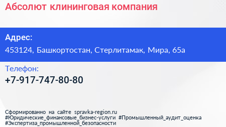 Абсолют, клининговая компания по адресу 453124, Башкортостан, Стерлитамак, Мира, 65а в дальнейшем Организация, размещена в следующих категориях: