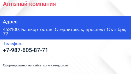Алтынай, компания по адресу 453100, Башкортостан, Стерлитамак, проспект Октября, 77 в дальнейшем Организация, размещена в следующих категориях: