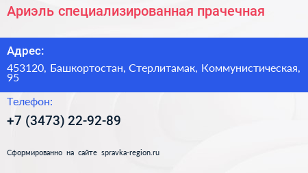 Ариэль, специализированная прачечная по адресу 453120, Башкортостан, Стерлитамак, Коммунистическая, 95 в дальнейшем Организация, размещена в следующих категориях: