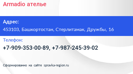 Armadio, ателье по адресу 453103, Башкортостан, Стерлитамак, Дружбы, 16 в дальнейшем Организация, размещена в следующих категориях: