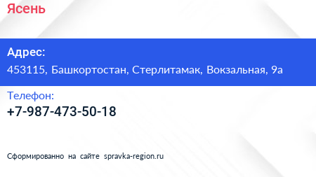 Ясень по адресу 453115, Башкортостан, Стерлитамак, Вокзальная, 9а в дальнейшем Организация, размещена в следующих категориях: