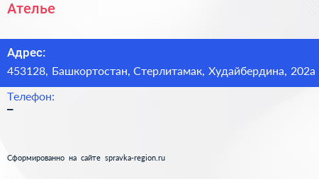 Ателье по адресу 453128, Башкортостан, Стерлитамак, Худайбердина, 202а в дальнейшем Организация, размещена в следующих категориях: