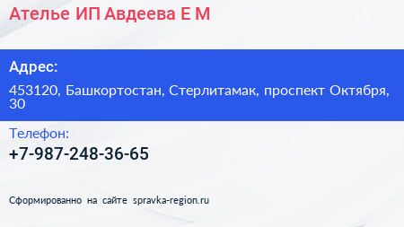 Ателье, ИП Авдеева Е.М. по адресу 453120, Башкортостан, Стерлитамак, проспект Октября, 30 в дальнейшем Организация, размещена в следующих категориях: