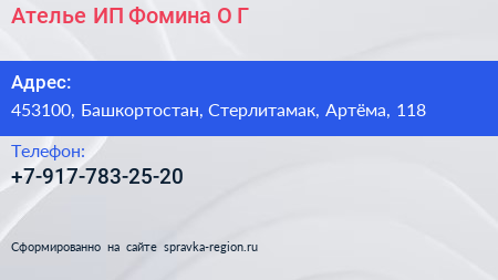 Ателье, ИП Фомина О.Г. по адресу 453100, Башкортостан, Стерлитамак, Артёма, 118 в дальнейшем Организация, размещена в следующих категориях: