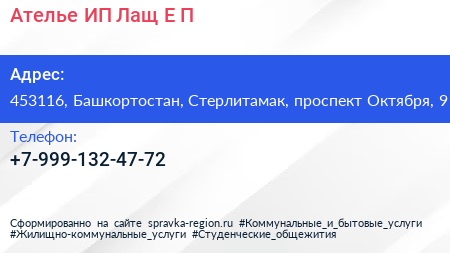 Ателье, ИП Лащ Е.П. по адресу 453116, Башкортостан, Стерлитамак, проспект Октября, 9 в дальнейшем Организация, размещена в следующих категориях:
