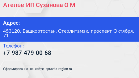 Ателье, ИП Суханова О.М. по адресу 453120, Башкортостан, Стерлитамак, проспект Октября, 71 в дальнейшем Организация, размещена в следующих категориях: