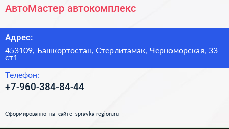 АвтоМастер, автокомплекс по адресу 453109, Башкортостан, Стерлитамак, Черноморская, 33 ст1 в дальнейшем Организация, размещена в следующих категориях: