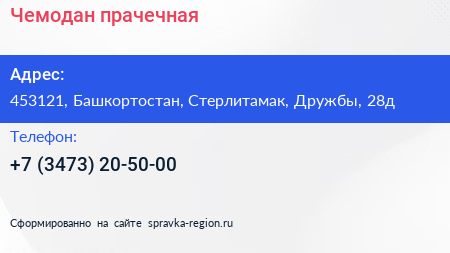 Чемодан, прачечная по адресу 453121, Башкортостан, Стерлитамак, Дружбы, 28д в дальнейшем Организация, размещена в следующих категориях: