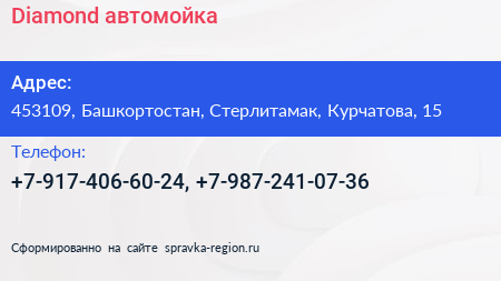 Diamond, автомойка по адресу 453109, Башкортостан, Стерлитамак, Курчатова, 15 в дальнейшем Организация, размещена в следующих категориях: