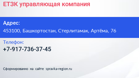 ЕТЗК, управляющая компания по адресу 453100, Башкортостан, Стерлитамак, Артёма, 76 в дальнейшем Организация, размещена в следующих категориях: