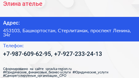 Элина, ателье по адресу 453103, Башкортостан, Стерлитамак, проспект Ленина, 34г в дальнейшем Организация, размещена в следующих категориях: