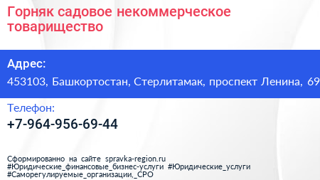 Горняк, садовое некоммерческое товарищество по адресу 453103, Башкортостан, Стерлитамак, проспект Ленина, 69 в дальнейшем Организация, размещена в следующих категориях: