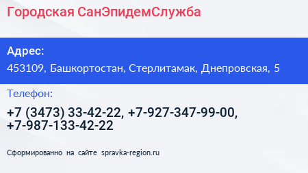 Городская СанЭпидемСлужба по адресу 453109, Башкортостан, Стерлитамак, Днепровская, 5 в дальнейшем Организация, размещена в следующих категориях: