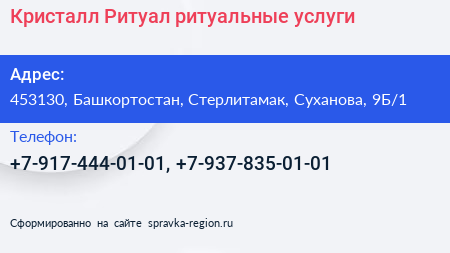 Кристалл Ритуал, ритуальные услуги по адресу 453130, Башкортостан, Стерлитамак, Суханова, 9Б/1 в дальнейшем Организация, размещена в следующих категориях: