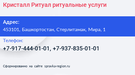 Кристалл Ритуал, ритуальные услуги по адресу 453101, Башкортостан, Стерлитамак, Мира, 1 в дальнейшем Организация, размещена в следующих категориях: