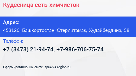 Кудесница, сеть химчисток по адресу 453126, Башкортостан, Стерлитамак, Худайбердина, 58 в дальнейшем Организация, размещена в следующих категориях: