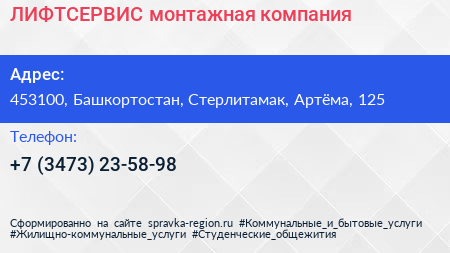 ЛИФТСЕРВИС, монтажная компания по адресу 453100, Башкортостан, Стерлитамак, Артёма, 125 в дальнейшем Организация, размещена в следующих категориях: