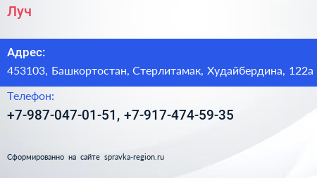 Луч по адресу 453103, Башкортостан, Стерлитамак, Худайбердина, 122а в дальнейшем Организация, размещена в следующих категориях: