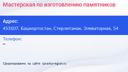 Мастерская по изготовлению памятников по адресу 453107, Башкортостан, Стерлитамак, Элеваторная, 54 в дальнейшем Организация, размещена в следующих категориях: