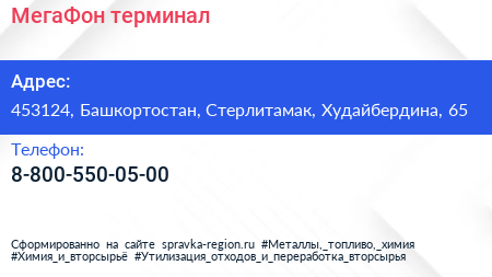 МегаФон, терминал по адресу 453124, Башкортостан, Стерлитамак, Худайбердина, 65 в дальнейшем Организация, размещена в следующих категориях:
