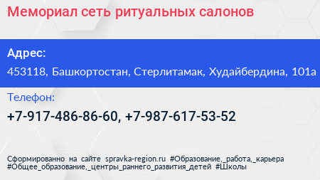 Мемориал, сеть ритуальных салонов по адресу 453118, Башкортостан, Стерлитамак, Худайбердина, 101а в дальнейшем Организация, размещена в следующих категориях: