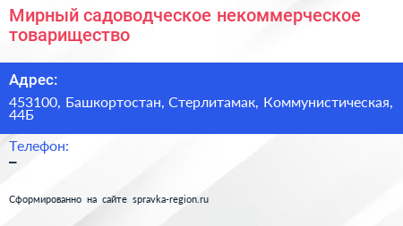 Мирный, садоводческое некоммерческое товарищество по адресу 453100, Башкортостан, Стерлитамак, Коммунистическая, 44Б в дальнейшем Организация, размещена в следующих категориях: