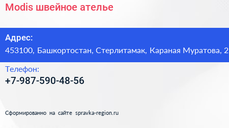 Modis, швейное ателье по адресу 453100, Башкортостан, Стерлитамак, Караная Муратова, 2 в дальнейшем Организация, размещена в следующих категориях: