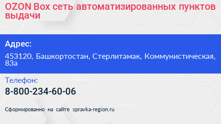 OZON Box, сеть автоматизированных пунктов выдачи по адресу 453120, Башкортостан, Стерлитамак, Коммунистическая, 83а в дальнейшем Организация, размещена в следующих категориях: