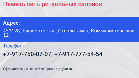 Память, сеть ритуальных салонов по адресу 453128, Башкортостан, Стерлитамак, Коммунистическая, 12 в дальнейшем Организация, размещена в следующих категориях: