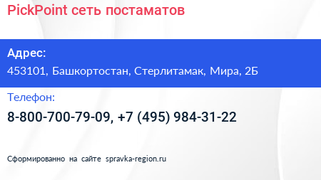 PickPoint, сеть постаматов по адресу 453101, Башкортостан, Стерлитамак, Мира, 2Б в дальнейшем Организация, размещена в следующих категориях: