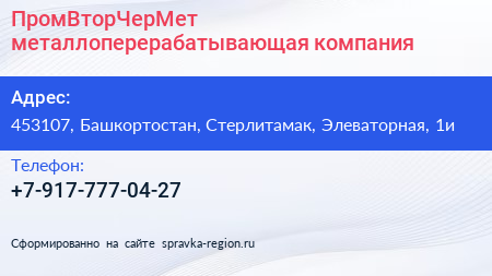 ПромВторЧерМет, металлоперерабатывающая компания по адресу 453107, Башкортостан, Стерлитамак, Элеваторная, 1и в дальнейшем Организация, размещена в следующих категориях: