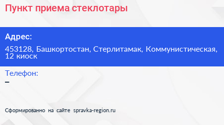 Пункт приема стеклотары по адресу 453128, Башкортостан, Стерлитамак, Коммунистическая, 12 киоск в дальнейшем Организация, размещена в следующих категориях: