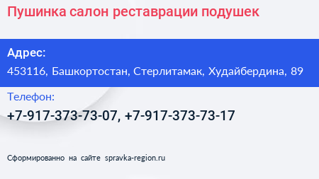 Пушинка, салон реставрации подушек по адресу 453116, Башкортостан, Стерлитамак, Худайбердина, 89 в дальнейшем Организация, размещена в следующих категориях:
