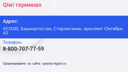 Qiwi, терминал по адресу 453100, Башкортостан, Стерлитамак, проспект Октября, 42 в дальнейшем Организация, размещена в следующих категориях: