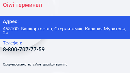 Qiwi, терминал по адресу 453100, Башкортостан, Стерлитамак, Караная Муратова, 2а в дальнейшем Организация, размещена в следующих категориях: