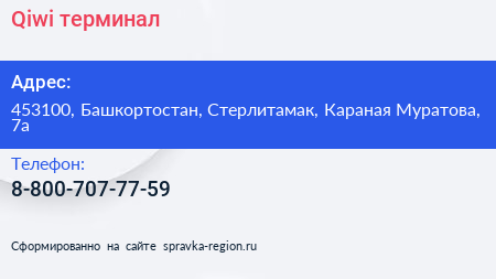 Qiwi, терминал по адресу 453100, Башкортостан, Стерлитамак, Караная Муратова, 7а в дальнейшем Организация, размещена в следующих категориях: