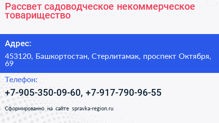 Рассвет, садоводческое некоммерческое товарищество по адресу 453120, Башкортостан, Стерлитамак, проспект Октября, 69 в дальнейшем Организация, размещена в следующих категориях: